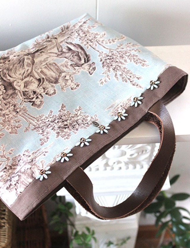 ★ 他サイトにも掲載しておりますので ご注文の前に、必ず在庫の確認メールを下さいませ。 リネン素材のトワル・ド・ジュイ布のトートバッグです。 スワロフスキーでビーズ刺繍を加えて 少しだけお洒落にしました。 持ち手は本革です。 後面は同じリネン素材で茶色の無地 バッグの口部分はマグネット式です <サイズの目安> 口部分の横幅 約30cm 底から口部分までの高さ 約21cm まち幅 約3cm *手作りですので、1作品ずつ多少の誤差は生じます。 予めご了承ください。 <納期> ご注文を頂いてから製作いたしますので 完成までに約1週間程度のお時間をいただきます。 <配送方法> ヤマト宅急便60cmサイズでお送りいたします。 <返品・交換・返金> 1. 下記を除き、商品の返品・交換は一切受け付けないものとします。 但し、 お買い上げの商品でなおかつ、以下の場合に限り受け付けるものとします。 (1) 商品に重大な瑕疵があった場合 (2) ご注文内容と異なる商品・個数が到着した場合 (3) 配送中に破損した商品の場合 2. 前項(1)から(3)のいずれかに該当する場合でも 下記のいずれかに該当する場合は受け付けることができないものとします。 (1) 商品到着後2日以内に事前にお問い合わせフォームよりご連絡をいただいていない場合 (2) 納品書並びに保証書が付属されている商品は保証書が同封されていない場合 (3) 使用済みあるいは、ご試着された形跡、洗濯後の商品 (4) タグ等を切り離したり、紛失されたりした商品 (5) お客様の元で汚れ、キズが生じた商品 (6) ボックス、布袋・ショッピングバッグ等のラッピング用品が不足している場合 (7) ご返送時の商品状態がお届け時と大きく異なっていた場合(箱・付属品含む) (8) 交換ご希望の商品が、交換対象外商品である場合 (9) こちらのショップでお買い上げの商品でない場合 3. 前項に定める返品を申請場合、返送にかかる費用は当社が負担し、 購入した時点の販売価格、送料、を返還するか又は代品に交換します。 なお、代品への交換を希望された場合においても、 商品の欠品等を理由に交換ができないことがあります。 4. 商品の発送処理後から商品到着までの間は、 商品のご注文の撤回および取消しをすることができません( 5,尚、手作り品のため、多少のサイズの誤差や サイトをご覧の環境による色の誤差 これらについては返品・交換・返金の対象には該当いたしません。 特にニットの場合、糸のロット(糸の染色日)の違いにより、 多少の色の誤差が生じます。 このことによる商品の返品、交換、返金は一切出来ません。