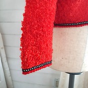 手編み 赤いモールヤーンのビーズ刺繍カーディガン