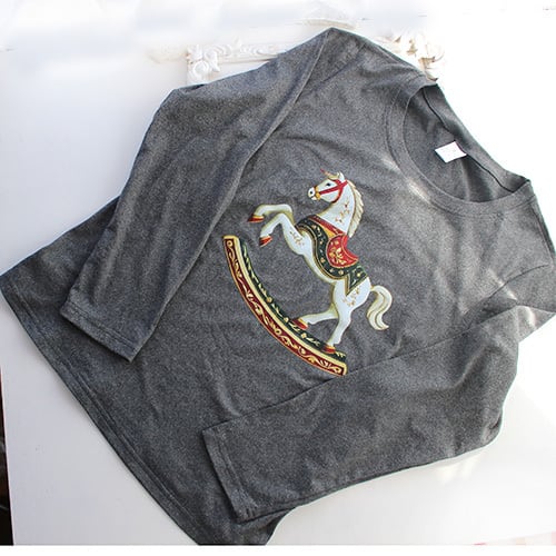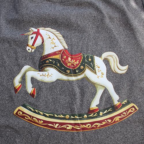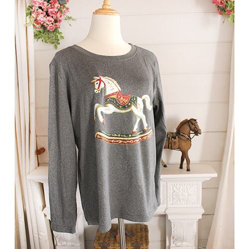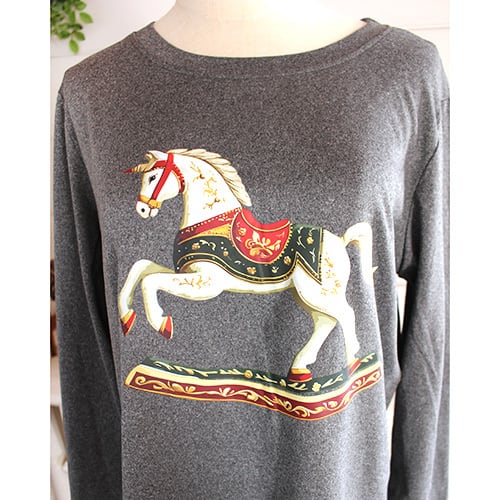 暖かみのあるグレーのTシャツに芦毛の馬柄が映えます