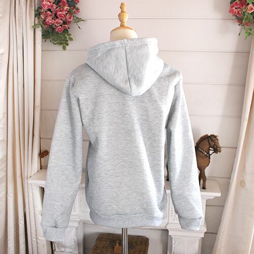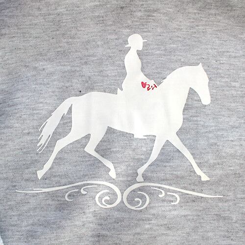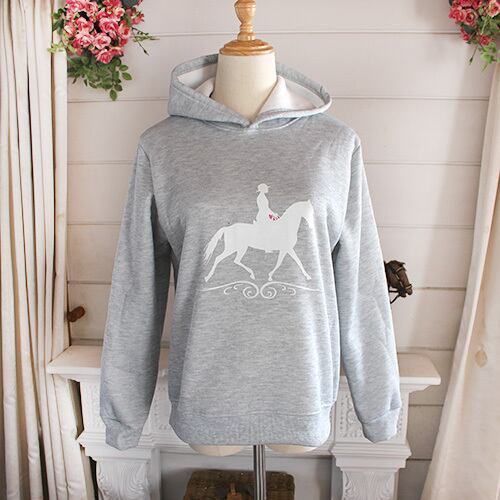 白い乗馬柄が施されたグレー色のパーカー