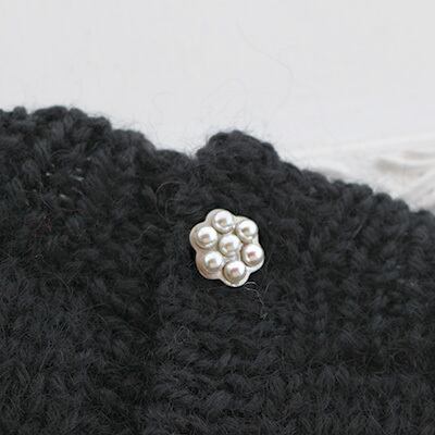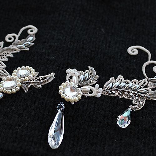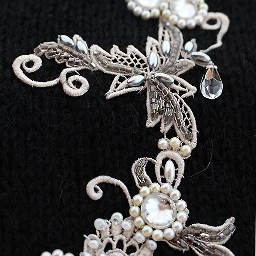 ヴィンテージのレースをセーターに細かく縫いつけ